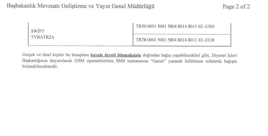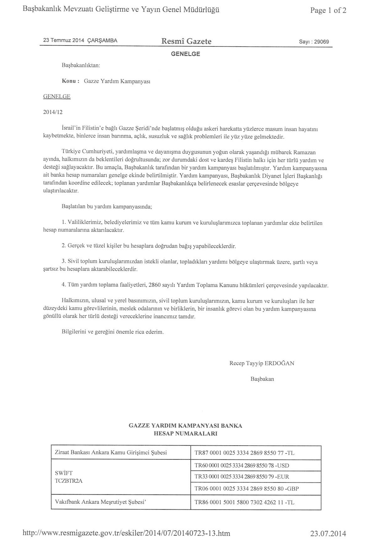 İsrail'in Gazze Şeridi'ne yönelik saldırıları nedeniyle zor durumda bulunan Gazze halkına insani yardım için başlatılan yardım kampanyasına ilişkin olarak 23 Temmuz 2014 tarihli ve 29069 sayılı Resmi Gazete'de yayımlanan 2014/12 sayılı Başbakanlık Genelgesi aşağıda sunulmuştur.