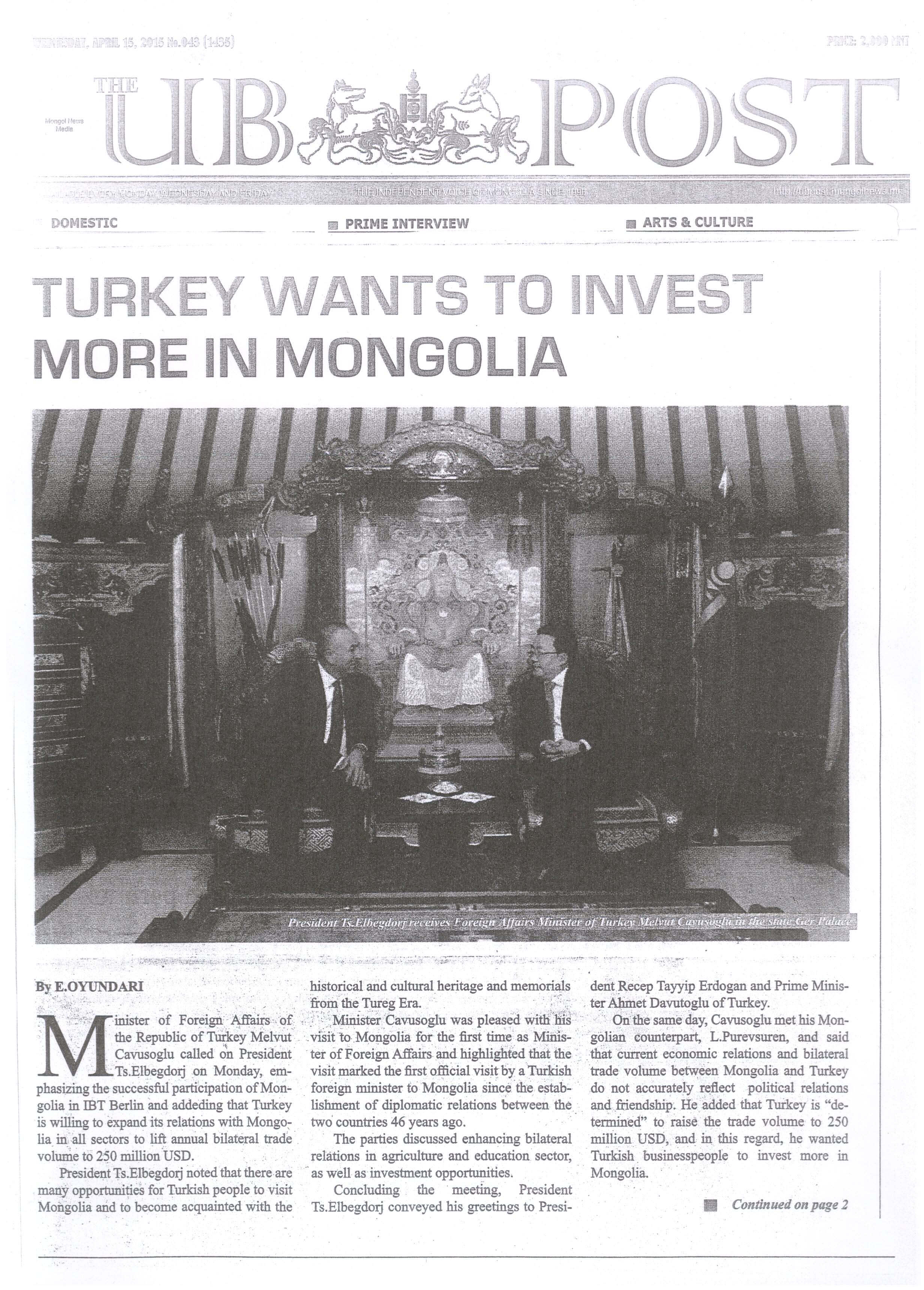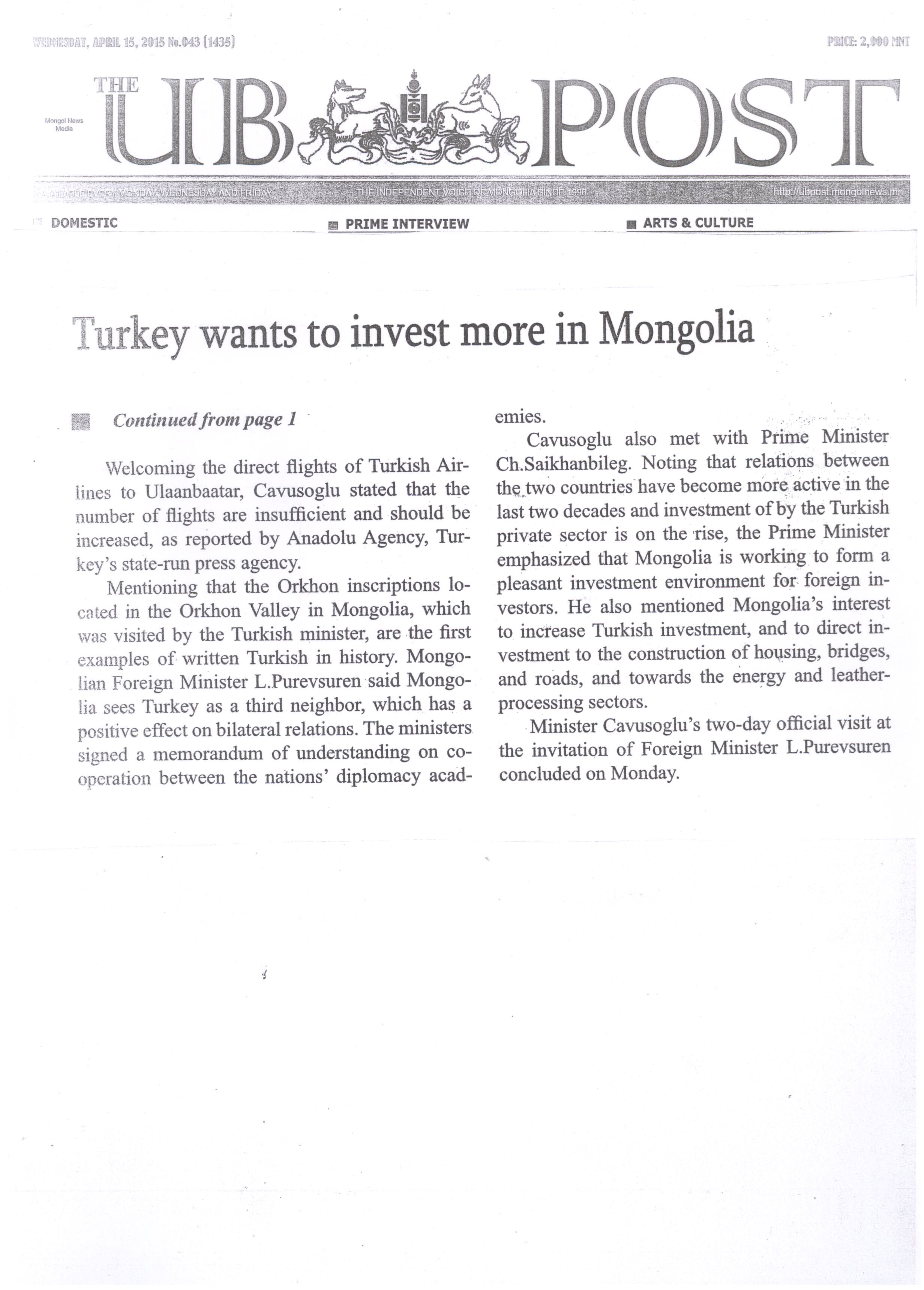 Sayın Bakanımızın 11-13 Nisan 2015 tarihlerinde Moğolistan’a gerçekleştirdiği resmi ziyaret hakkında haftada üç kez İngilizce yayınlanan “The UB Post” gazetesinin 15 Nisan 2015 tarihli nüshasında birinci sayfadan neşredilen haberin kesiti ilişikteyer almaktadır.