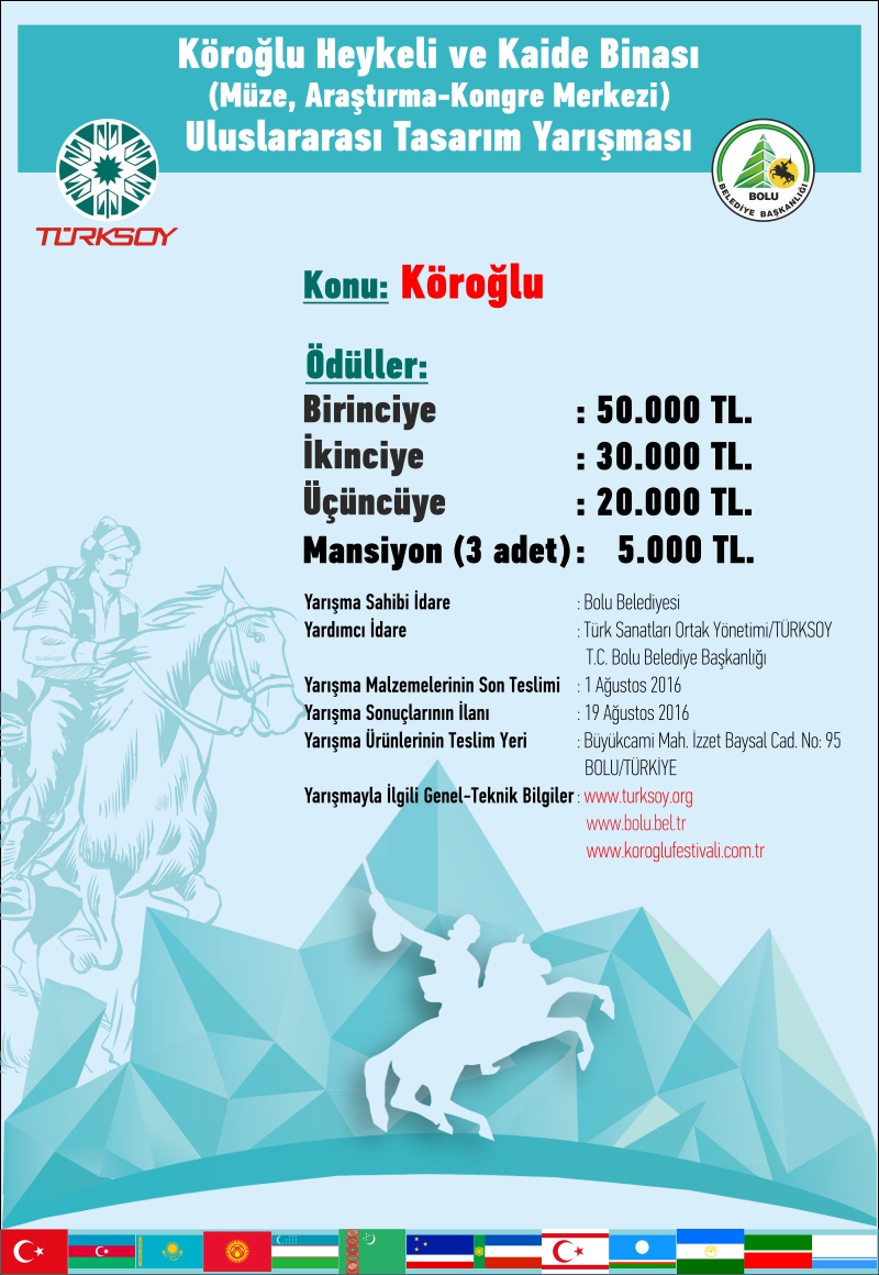 Bu yıl dördüncüsü gerçekleştirilecek olan Uluslararası Köroğlu Festivali kapsamında, Bolu Belediyesi ile Uluslararası Türk Kültürü Teşkilatı’nın (TÜRKSOY) himayelerinde “Köroğlu Heykeli ve Kaide Binası Uluslararası Tasarım Yarışması” isimli ödüllü bir anıt heykel yarışması düzenlenmektedir.