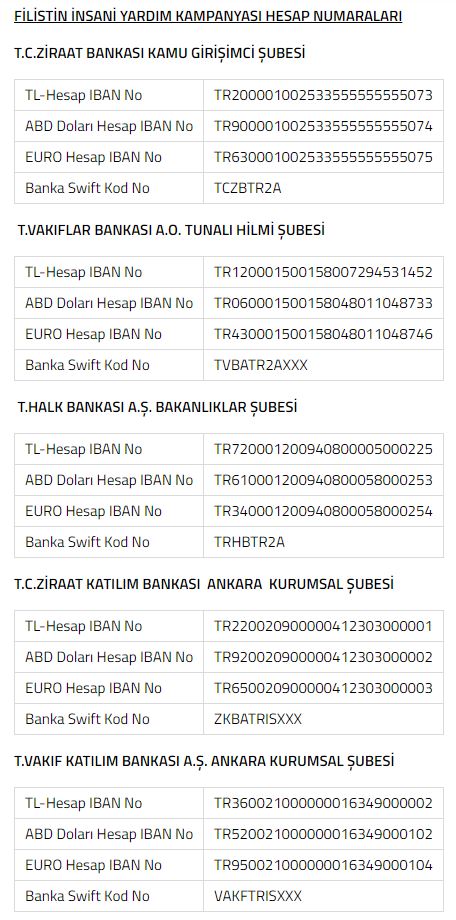 Dost ve kardeş Filistin halkının karşı karşıya bulunduğu sıkıntıların hafifletilmesi amacıyla 8 Mayıs 2018 tarihli Resmi Gazete’de yayımlanan 2018/10 sayılı Başbakanlık Genelgesi ile bir yardım kampanyası başlatılmıştır. Yardım Kampanyası için kullanılabilecek hesap numaraları aşağıda sunulmaktadır.
